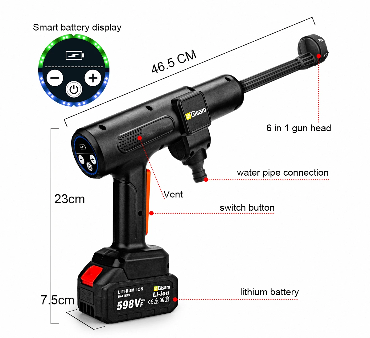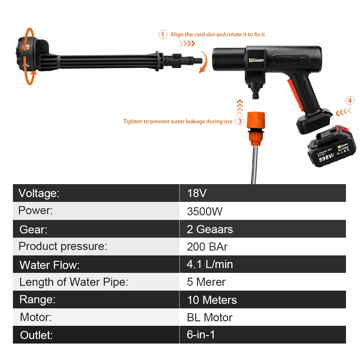 Note:The water gun can be directly connected to the faucet to operate the water supply, but the water gun is selfpriming. When you connect the faucet, the water gun will automatically discharge water without operating the switch. All cordless water guns are like this, please understandSpecifications:Voltage:18VPower:3500WGear:2 GearsProduct pressure:100-200 BARWater Flow: 4.1 L/minLength Of Water Pipe: 5 MeterRange: 10 MetersMotor: Brushless MotorOutlet: 6-in-1Features:-Cordless design, powered by Li-Ion rechargeable battery, convenient for outdoor working- Flexible use,easy to clean.-15000 mA large capacity lithium battery , convenient for outdoor use- Lightweight and convenient, long battery life.- User-friendly comfort handle, long-term grip is effortless.- You can clean anywhere there is water,including using a bucket, bottle, stream or pool.- Stainless steel fine screen, high efficiency and deep filtration, deep double filtration of impurities in water, long service life of protection pump.