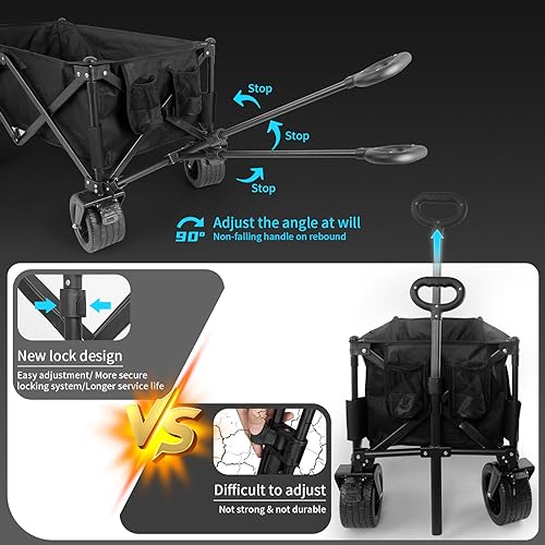 • Long-Lasting Efficient Transport : Beach wagon with big wheels for sand,our beach wagon comes with a high-strength steel frame and durable 600D oxford polyester, the capacity heavy duty collapsible wagon cart can be up to 100 kg/220 Lbs.The hollow-plate bottom plate won't be broken after being bent.beach wagon handle is adjustable in length and angle, with a knuckle lock handle available, for effortless transport.