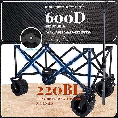 Collapsible Folding Wagon, Beach Wagon Cart Heavy Duty Foldable with Big All-Terrain Beach Wheels for Sand, Collapsible Outdoor/Garden Utility Wagon cart - 220lbs Weight Capacity