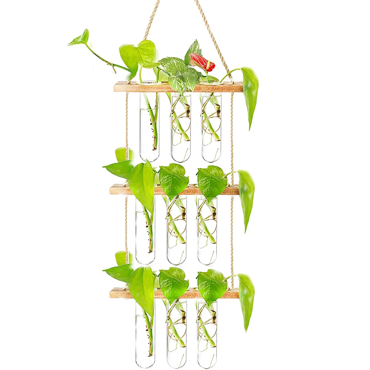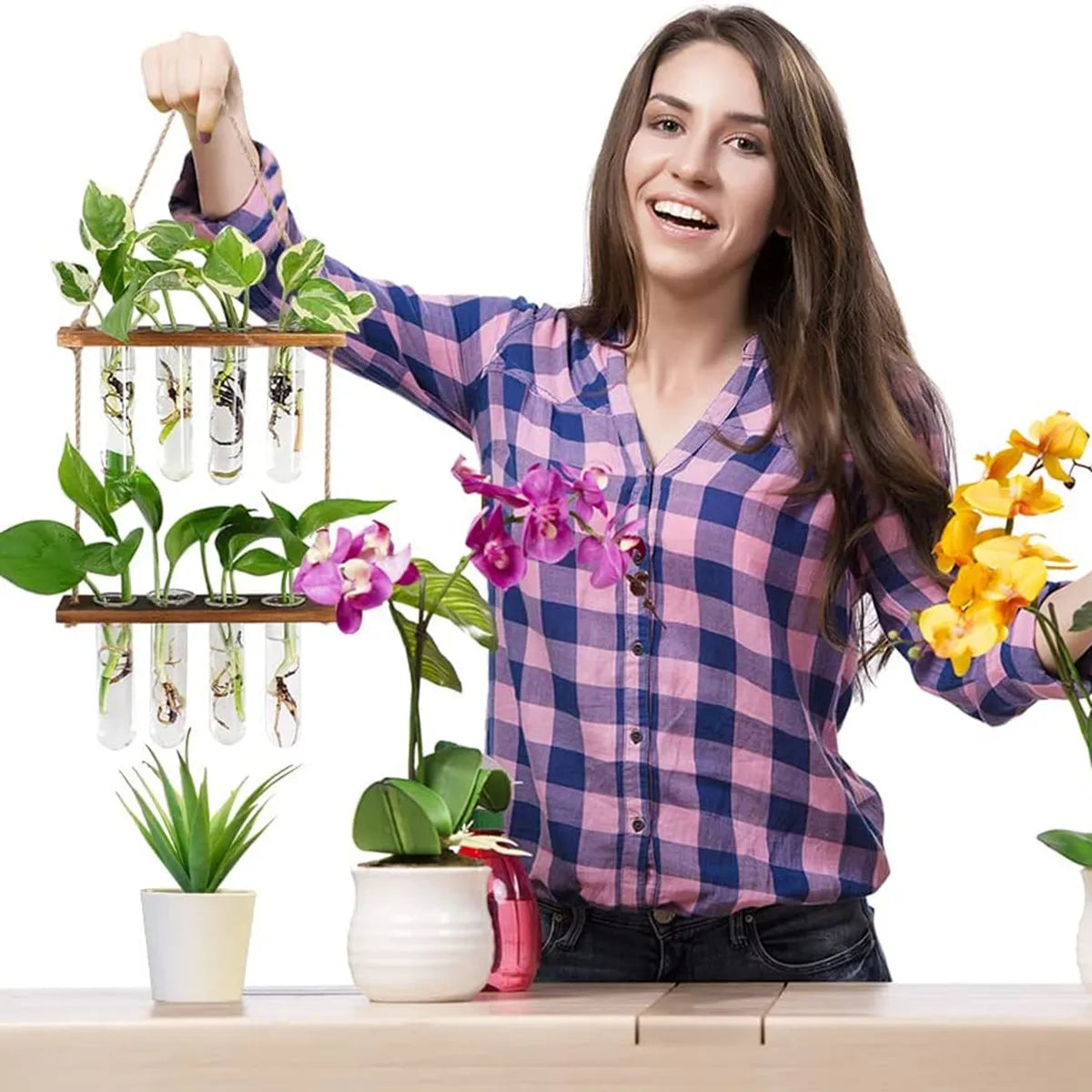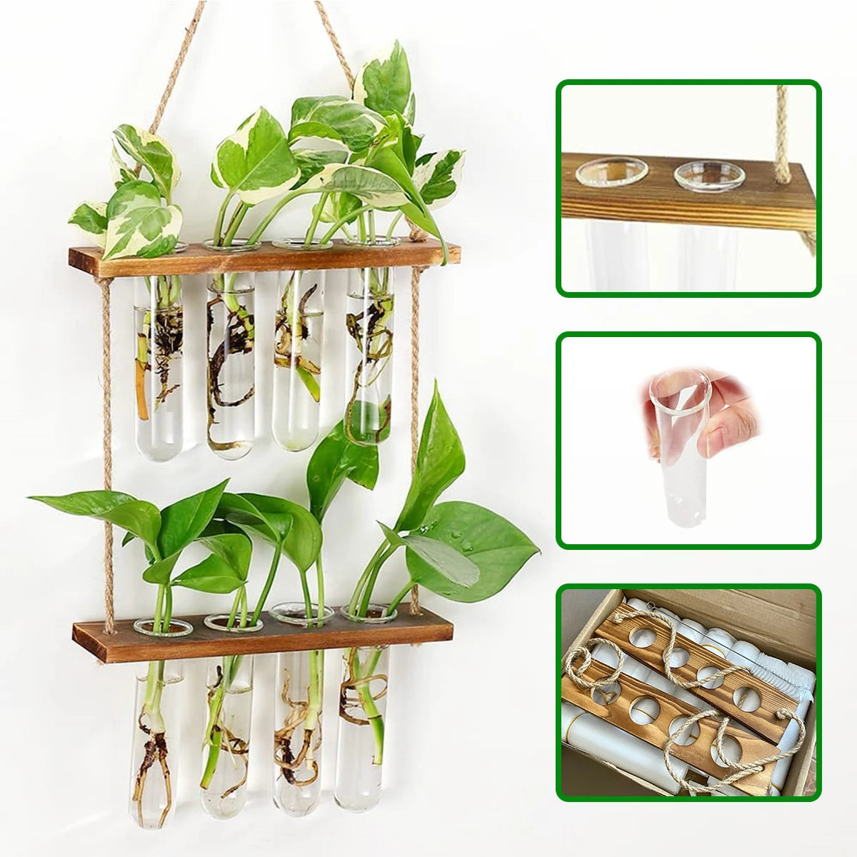Bring a touch of vintage charm and natural beauty to your space with this retro test tube wall hanging planter. This unique planter combines the classic look of test tubes with a beautifully crafted multilayer wooden stand, creating a stylish and eye-catching display for your favorite plants. Whether you're looking to add a touch of greenery to your living room, bedroom, kitchen, office, or garden, this planter will enhance the aesthetic of any space. The hydroponic vases are perfect for growing plants in water, making them easy to care for and maintain.