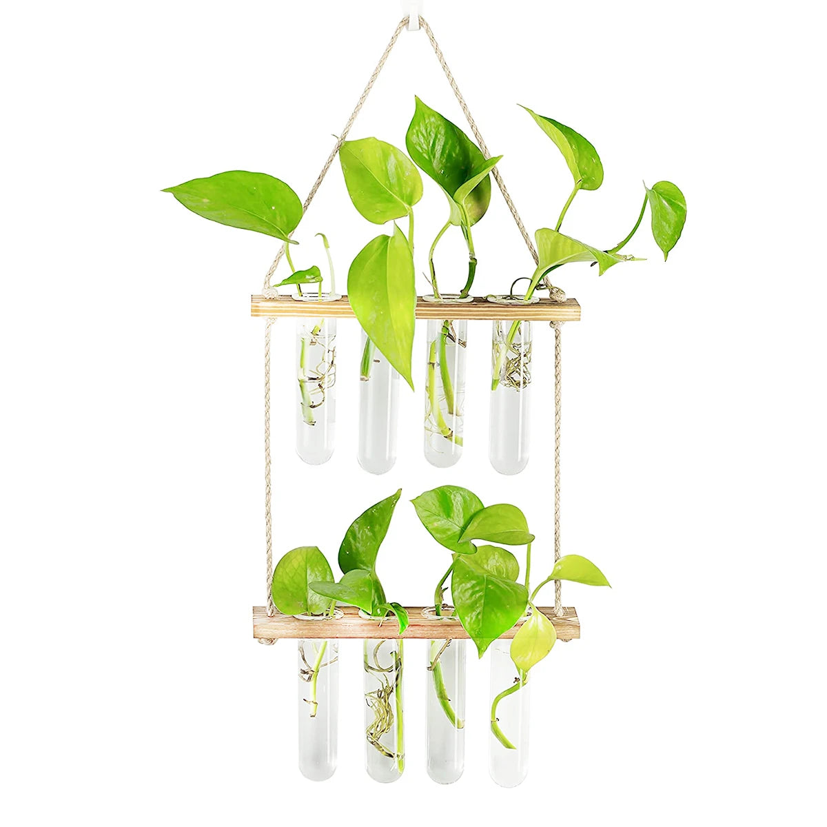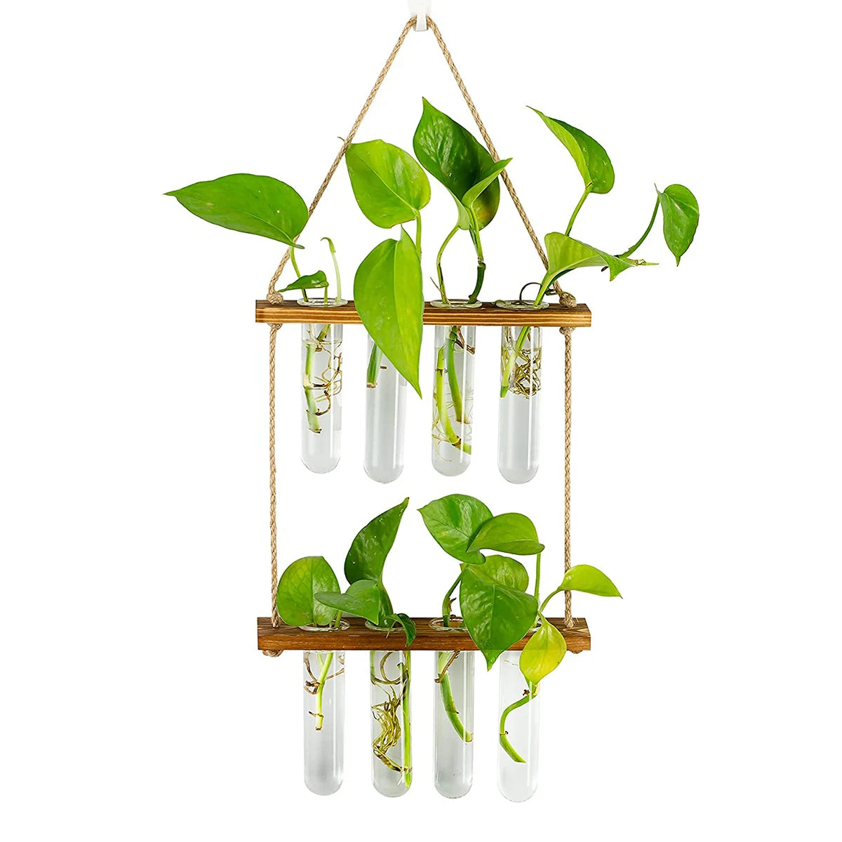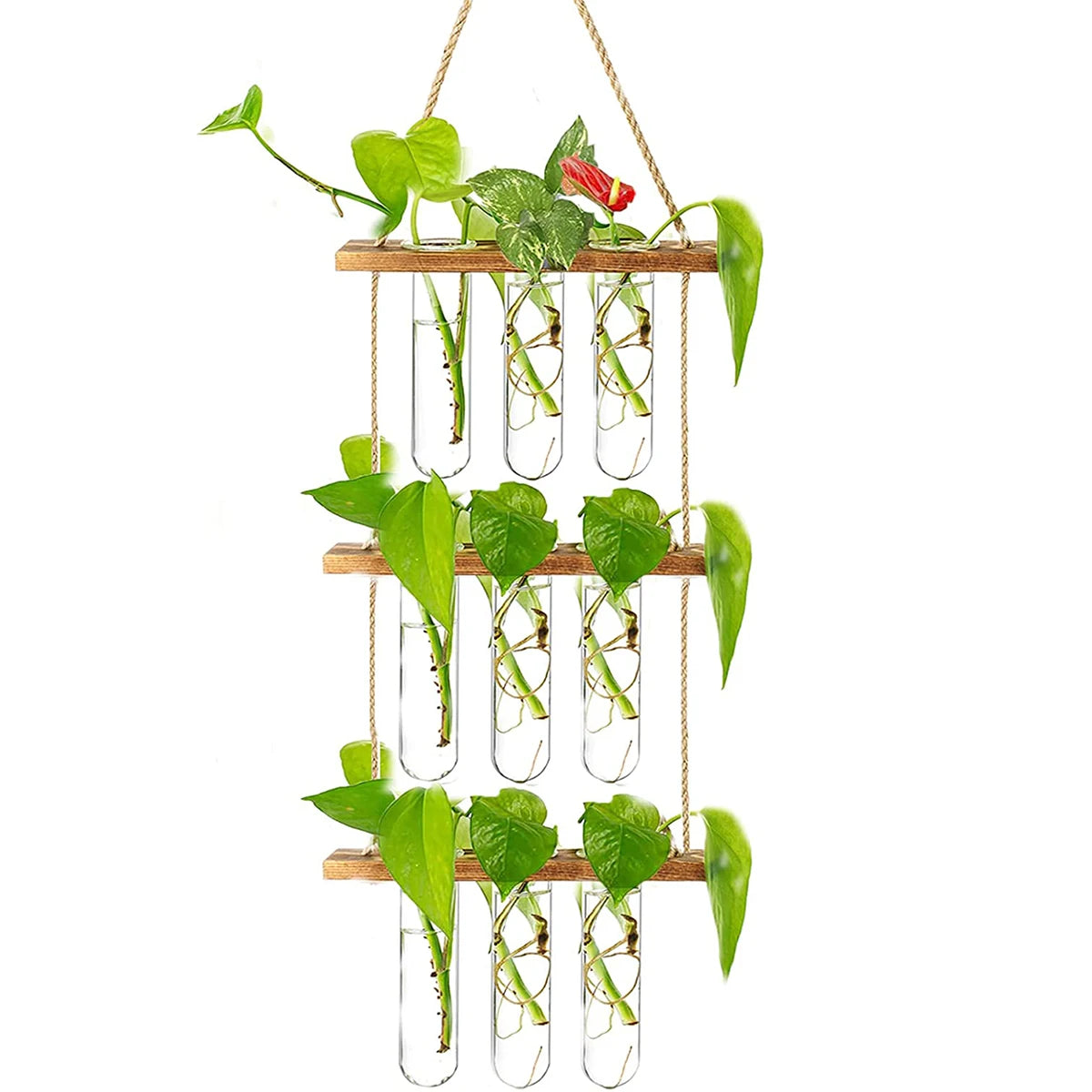 Bring a touch of vintage charm and natural beauty to your space with this retro test tube wall hanging planter. This unique planter combines the classic look of test tubes with a beautifully crafted multilayer wooden stand, creating a stylish and eye-catching display for your favorite plants. Whether you're looking to add a touch of greenery to your living room, bedroom, kitchen, office, or garden, this planter will enhance the aesthetic of any space. The hydroponic vases are perfect for growing plants in water, making them easy to care for and maintain.
