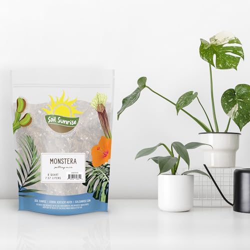 Soil Sunrise Monstera Deliciosa Exotic Houseplant Potting Mix; Monstera Deliciosa Soil Media, Choose Medium or Bulk Size These plants are unusual as they were first mixed up with Philodendrons. However, they are not related to them. They originate from Central America. We wanted to make a blend of potting mix optimized for this unique plant. TIPS: Yellow or Yellowing Monstera leaves are a sign that your plant may not be getting enough air or water. If you are using a mix that doesn’t offer enough drainage, your plant will be sitting in water. In simple terms, it’s drowning! If you are using a mix that doesn’t hold enough water, your plants may not be able to take in the water they need. This can also cause yellow leaves. Brown spots are a symptom of root rot caused by overwatering. These spots may appear small and then enlarge and/or spread throughout the plant over time. INGREDIENTS: peat moss, perlite, coconut coir, fir bark, worm castings, horticultural charcoal, and lime