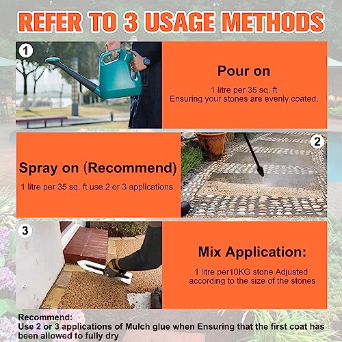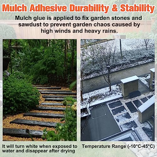 • Sturdy and Long-lasting: Mulch Glue dries in 12 - 24 hours depending on weather conditions, No mixing is required Shake and pour into a garden sprayer. and will last 12 months before re-application. providing ongoing stability and beauty to your landscaping.