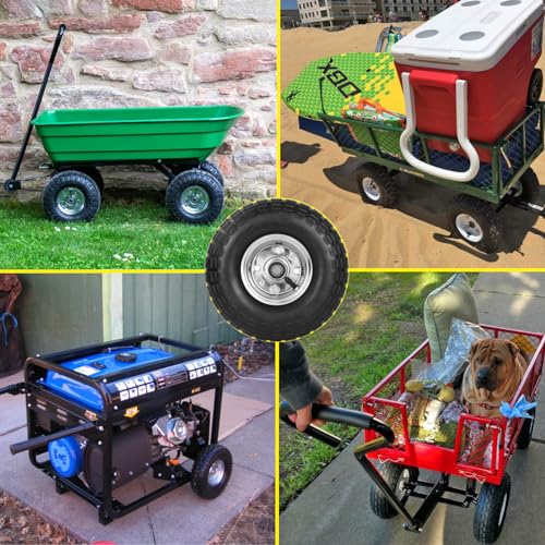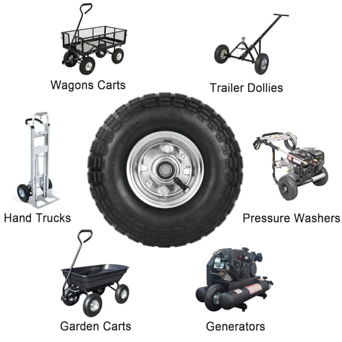 • 【Widely Fits】4.10/3.50-4" 10-inch rubber tires have a universal 5/8-inch axle bore hole that are perfect for your hand trucks,garden cart,Wagon cart,wheelbarrows,yard wagon,lawn mower,snow blowers,generators,trailer dollies,sack trolleys,pressure washers, air compressors, all purpose utility tire,etc(Not for highway use).