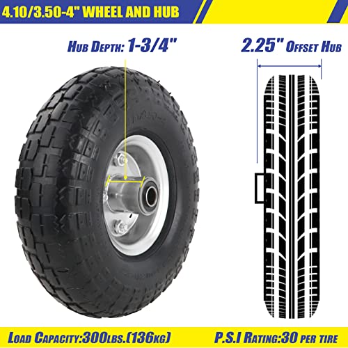 • 【Specification】Tire Mode: 4.10/3.50-4, Tire Diameter:10",Wide: 3.1", Axle Bore Diameter: 5/8" with Double Sealed Bearings, Hub Depth: 1-3/4" Offset Hub. Load Capacity: 300 lbs(136 KG)-P.S.I. Rating: AT30. Please pay attention to check whether your old tire model matches before buying.