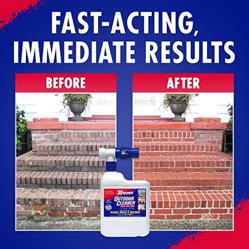 30 SECONDS 64oz Outdoor Cleaner with hose end attachment, cleans tough stains from organic growth fast, without the need to Pressure wash. This effective, fast-acting outdoor cleaner can be used on a variety of surfaces including wood decks, concrete driveways, sidewalks, stucco, vinyl siding, brick walls and fences. If its outdoors and dirty from all your humidity or wet weather, 30 SECONDS Outdoor Cleaner can clean it all fast! Simply spray on and hose off to create a look like-new surface. Safe around plants and lawns.