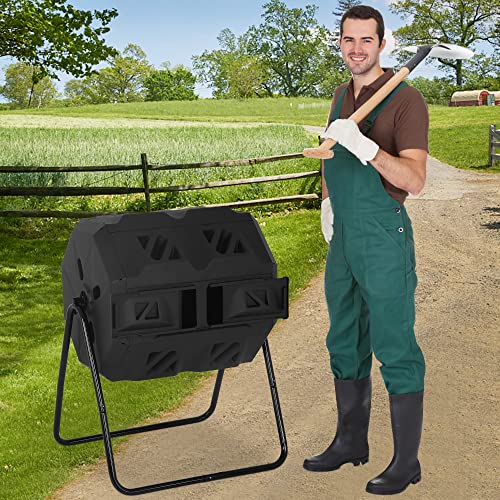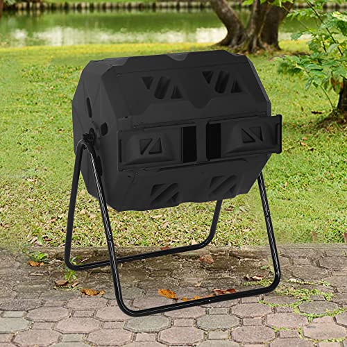 43 Gallon Compost Bin with Dual Chamber Sliding Doors, Outdoor 360° Tumbling Rotating Composting Bins Solid Steel Frame Gardening Compost Tumbler Bucket Trash Can for Patio Yard Waster, Black Door