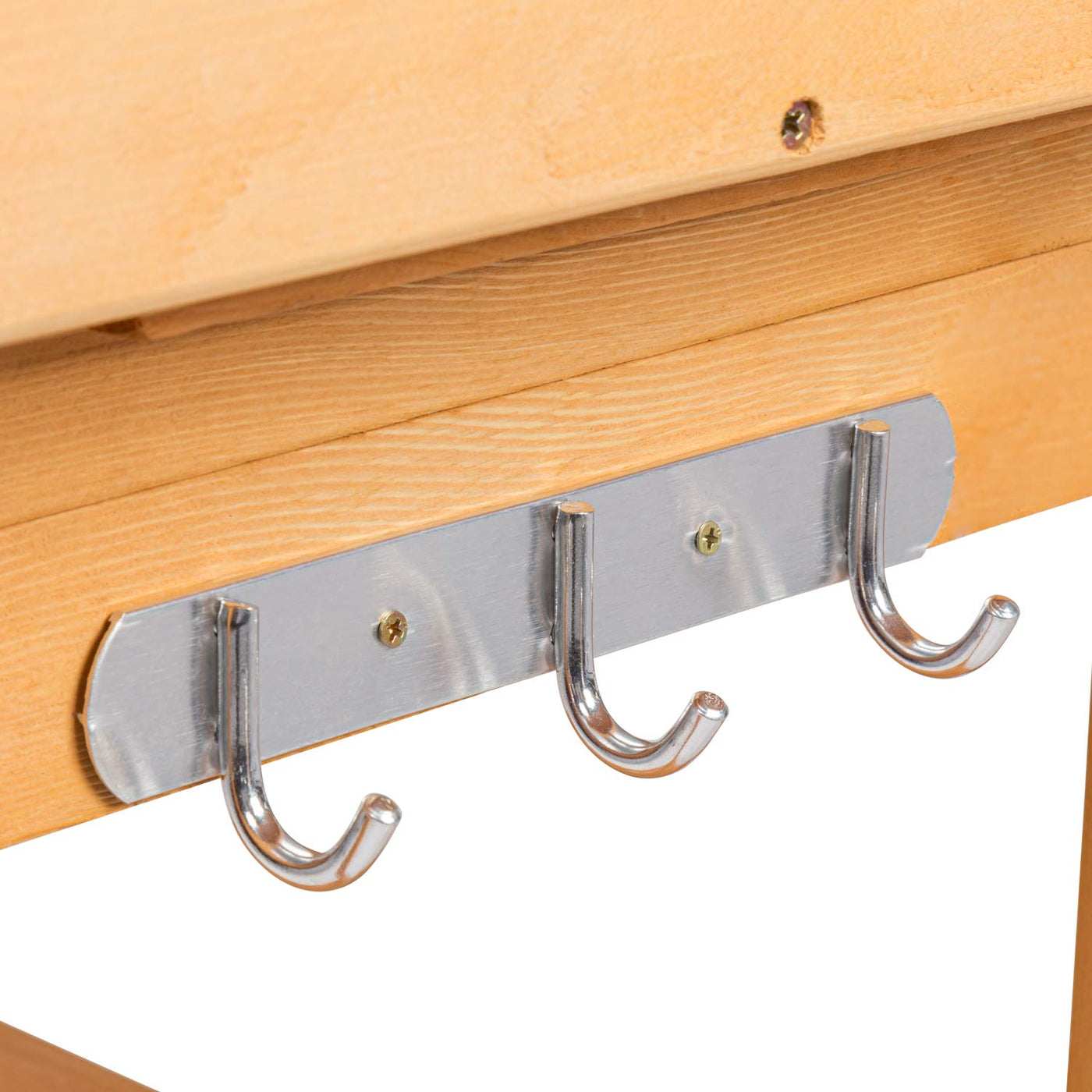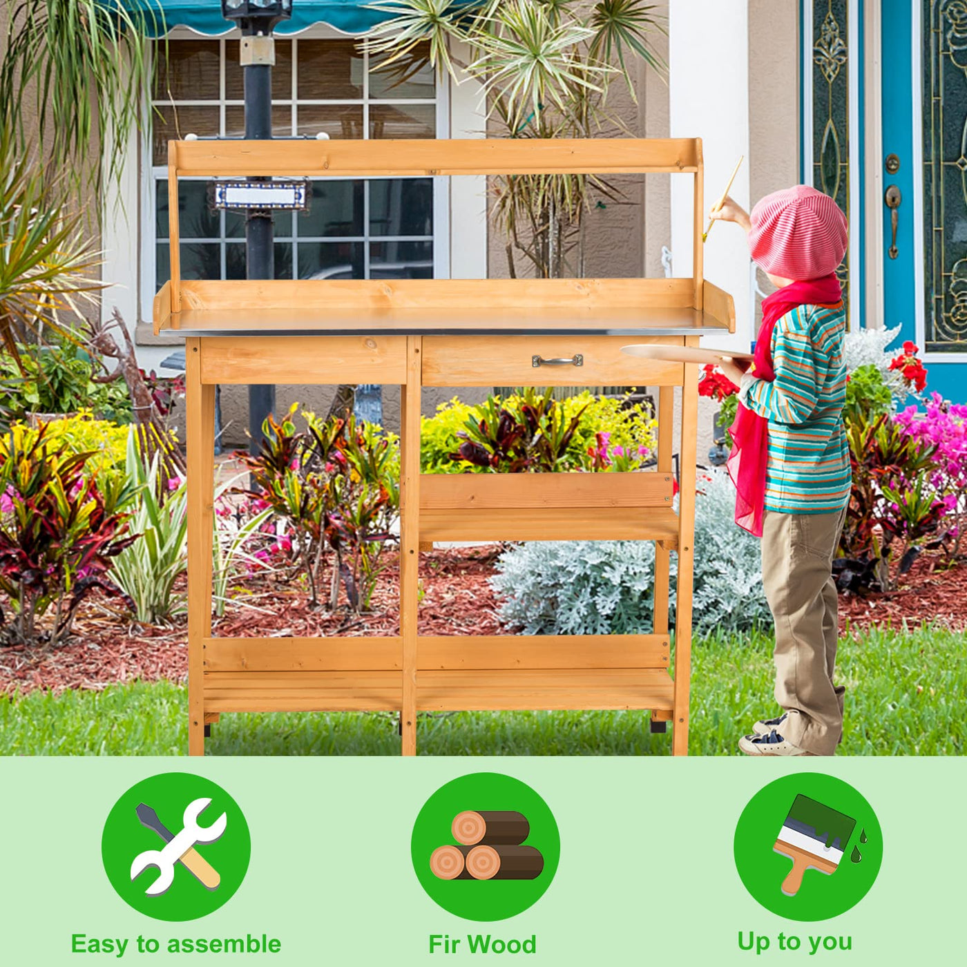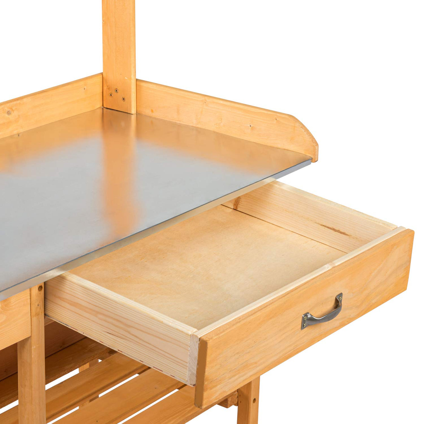 This garden potting bench table is made of high quality fir wood with painting treatment, which is perfect for patios, balconies or backyard gardening. The galvanization tabletop gives you a larger space to treasure your planters. The right side hooks is convenient for hanging with the drawer and rack shelves collecting all your work tools in one place, making everything neat and clean. Specifications: Material: Fir wood Inner drawer space: 19.9" x 18.3" x 3" (L x D x H) Overall dimensions: 38.9" x15.9" x49" (L x W x H) Weight capacity: Tabletop: 221lbs; Drawer: 22lbs; Left shelf: 88lbs; Right shelves: 88lbs Weight: 36lbs Package Included: 1 x Potting bench 1x Instruction