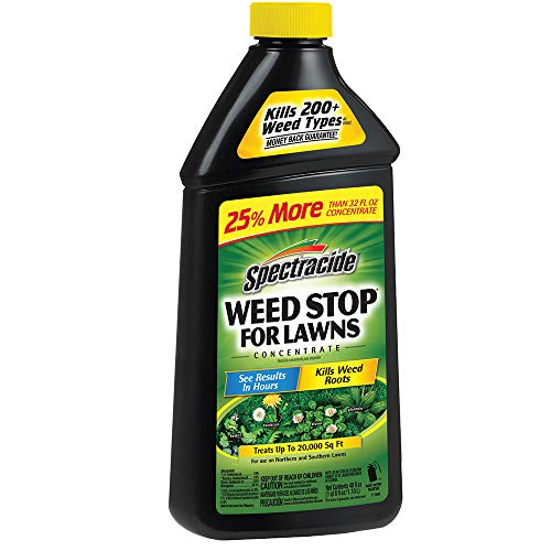 The power is in your hands to keep your landscape in line – unleash it with Spectracide lawn and garden products. Our easy-to-use, fast-acting insect, lawn disease and weed control solutions help you tame lawn and landscape invaders with incredible pest-punishing power. Take command with Spectracide brand. You hold the power.Spectracide Weed Stop For Lawns Concentrate controls more than 200 types of weeds as listed – and it won’t harm your lawn when used as directed. This concentrated formula kills down to the root, with overnight results. It controls all major broadleaf weeds, including dandelion, chickweed and clover (see product label for complete list). This product is rainfast in 6 hours, so it won’t wash off. Mix with water and apply with a garden sprayer (sold separately) at the rates directed on the label.for best results, mow before treating weeds with Spectracide Weed Stop For Lawns Concentrate. Spray in spring when weeds are small and growing, or in fall when many problem weeds germinate – treating in fall will eliminate many of next year’s weeds. If certain tough weeds are not dead within 3 weeks, repeat spot treatment. Read the entire label before using