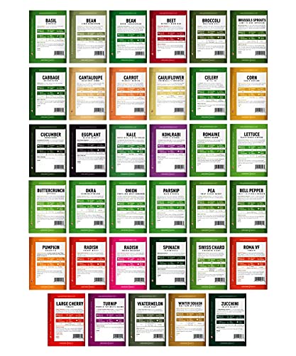 All garden seeds come in individual paper seed envelopes. Complete with instructions and growing guides for each plant. Paper seed packets are essential. Seeds stored in plastic baggies can let moisture in, cause mold and bacteria, thus rendering your seeds useless. Our seeds are proudly sourced and packaged in the USA. All seeds are heirloom, non gmo, non hybrid, and open pollinated. You can save seeds for future harvest. We've included a large variety of veg seeds! You can either have a complete garden or feel safe in your bugout bag survival kit, knowing you have all you need to grow a huge garden to feed yourself, family, neighbors, and more. Heirloom seeds make great gifts for that hard to buy person, garden enthusiast, retirees, survivalist, and more! 25 Year Shelf Life - Store seeds in a cool, dark place. Seeds are great for growing in containers, aquaponics, hydroponics, and vertical gardening. Type-Approximate Seed Count Basil-Genovese or Large Italian 150 Bean-Lima 25 Bean-Bush 20 Beet-Detroit Dark Red 180 Broccoli-Waltham 29x1 350 Brussel Sprouts-Long Island Improved 250 Cabbage-Golden or Red Acre 300 Cantelope-Hales Best Jumbo 50 Carrot-Scarlet Nantes 1800 Cauliflower-Snowball Y Improved 300 Celery-UT-52-70 3000 Corn-Early Bantam 50 Cucumber-Marketmore 50 Eggplant-Black Beauty 75 Kale-Bates Blue Scotch Curled 300 Kohlrabi-Purple Vienna 75 Lettuce-Romaine 2300 Looseleaf Lettuce-Black Seeded Simpson 2300 Bibb Lettuce-Butterhead Buttercrunch 2300 Okra-Clemson Spineless 50 Onion-Bunching Tokyo Long White 250 Parsnip-Harris Model 250 Pea-Snap Sugar Daddy 25 Pepper-California Wonder 100 Pumpkin-Sugar Pie 15 Radish-Cherry Belle 200 Radish-French Breakfast 300 Spinach-Bloomsdale or Viroflay 125 Swiss Chard-Fordhook Giant 100 Paste Tomato-Roma VF or San Marzano 180 Tomato-Large Cherry 100 Turnip-Purple Top White Globe 500 Watermelon-Sugar Baby 35 Winter Squash-Waltham Butternut 25 Zucchini-Black Beauty 25
